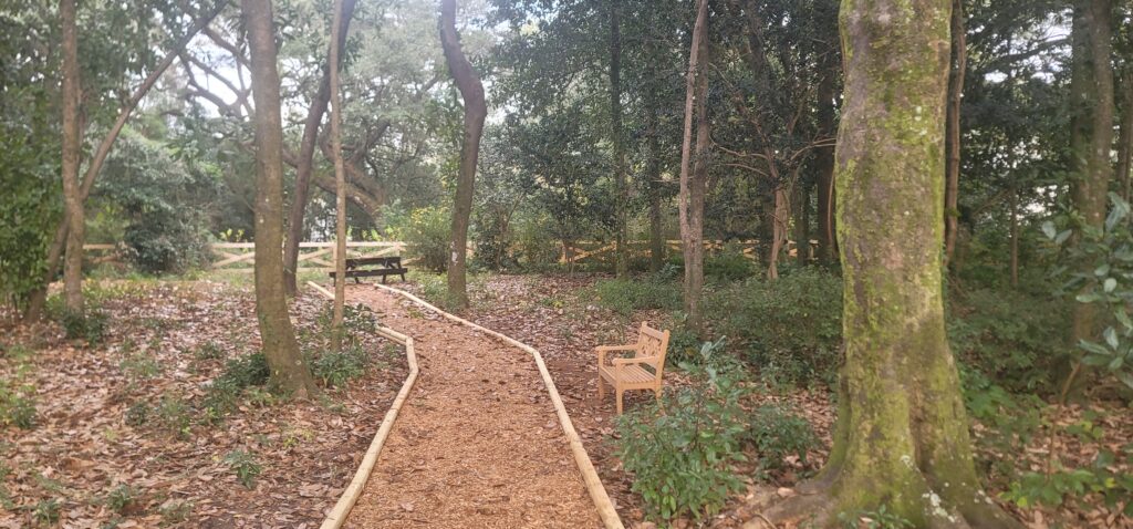 Although it isn’t finished, you can now walk the grounds and enjoy the camellia’s that will begin to bloom in November and listen to the birds in the trees.